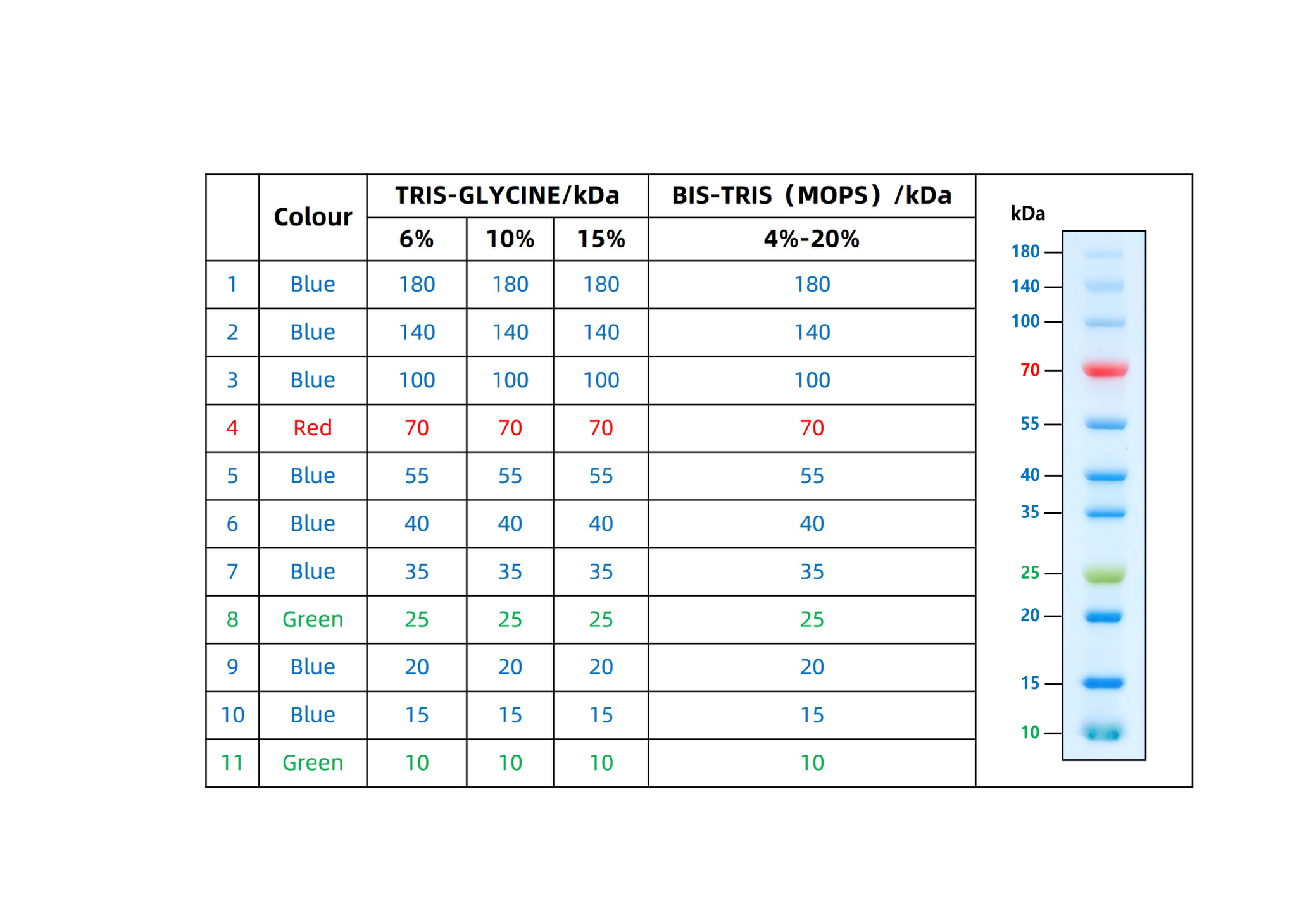- 5.Wide Band Range: Multiple bands with a broad range (10-180 KD for Tris-Glycine/Bis-Tris (MES) buffer; 9-170 KD for Bis-Tris (MOPS) buffer)
